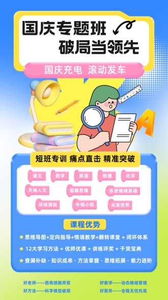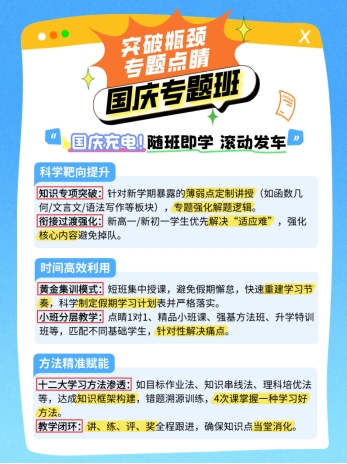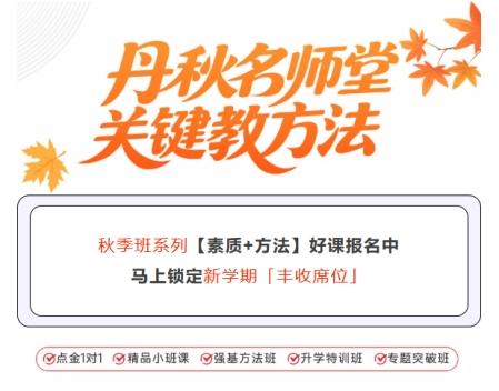 为助力同学们在秋季稳妥起步,开局领先,丹秋名师堂推出“国庆专题班”,通过系列精心设计的专题短班课程,大咖师资的方法指导,让同学们在国庆点睛、突破瓶颈、轻松跃升!