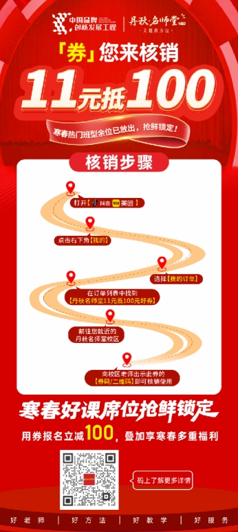 丹秋名师堂「11元抵100元」好券引爆寒春热潮,万余张优惠好券抢入,千百个家庭的坚定选择,是家长同学们对未来的智慧规划,也是对丹秋名师堂的高度认可!