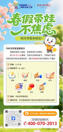 春假带娃不焦虑,阿丹学委来救急!丹秋名师堂免费托管、免费答疑、免费自习空间,让孩子玩有所乐、学有所获,家长安心无忧。