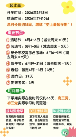 3月2日,同学们将正式迎来2026年春季新学期。然而,这个新学期,有点不一样——堪称“史上最短学期”,时间紧、节奏快、内容不减……所有教学任务都要在短期内完成,这意味着: