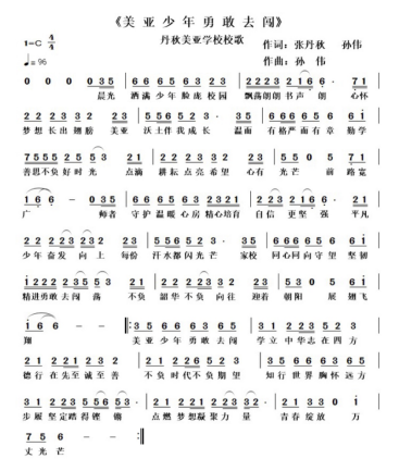 校歌由张丹秋校长与孙伟老师联袂作词,孙伟老师独立完成作曲、编曲与全程制作。开篇“晨光洒满校园,书声浸润心房”,勾勒书香学府的清雅意境;主歌凝练“温而有格、严而有章、勤学善思” 的校风内核,诠释严慈相融、知行共生的育人底色;副歌“美亚少年,勇敢去闯,学立中华,志在四方”,铿锵豪迈、气势恢宏,凝练诠释立德树人、知行合一的办学宗旨。整首乐曲节奏昂扬、传唱度高,词句开阔隽永,尽显专业创作水准,兼具艺术审美与精神感召力。
